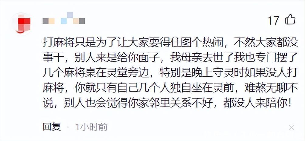 zh皇冠完整比分网还有网友为人师表,他说他母亲死字的手艺,他有益摆了几个麻将桌在灵堂傍边,即是让守灵的东说念主打麻将,让人人图个吵杂。