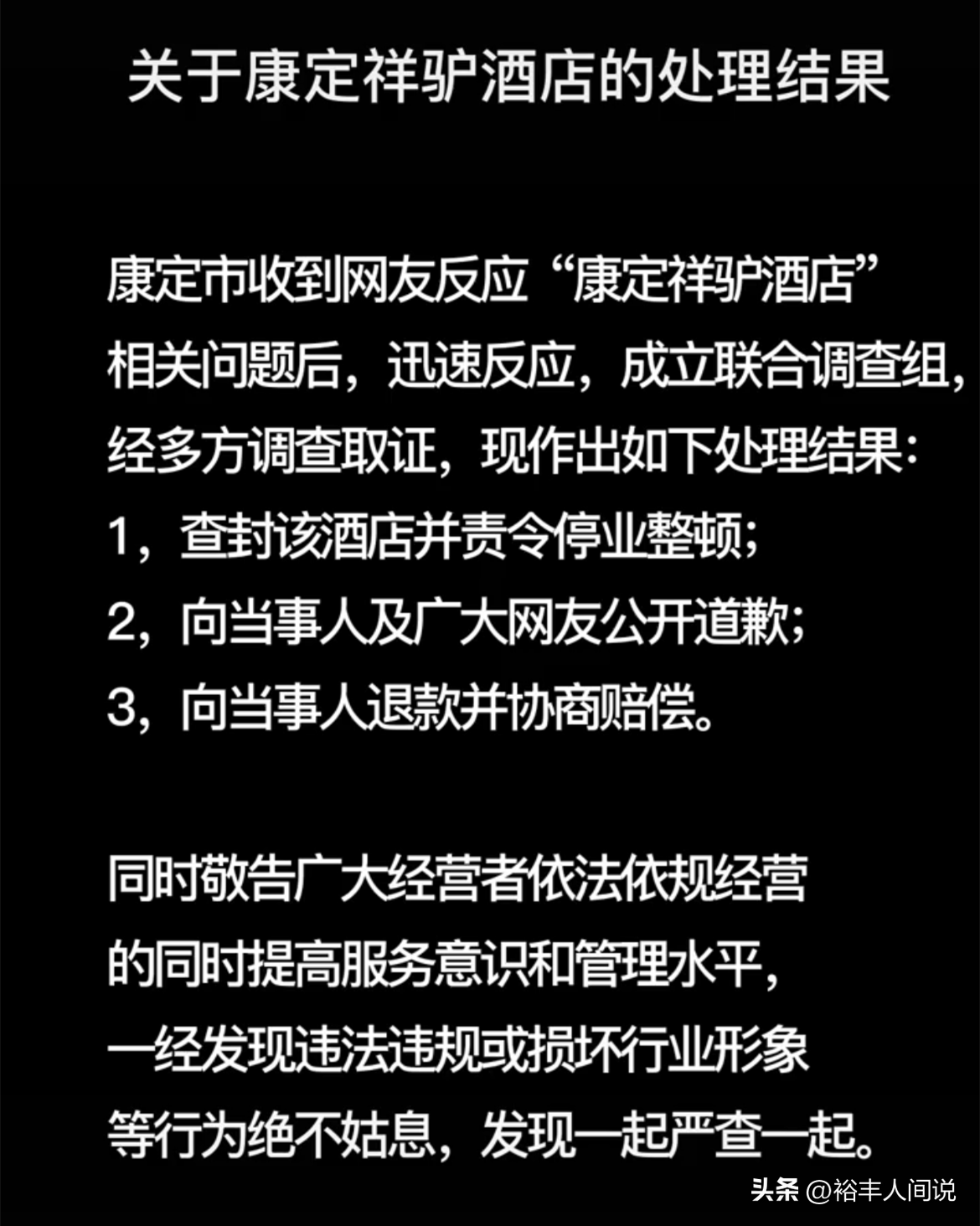 与此同期,当地旅游部门也公开了此事的处理着力,并对“受害者”越过嗜好。从曝光的图片中不丢丑出,“吕翔旅店”仍是被暂时查封整改,并向当事东谈主谈歉,协商补偿等等。