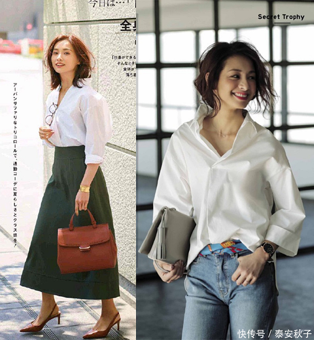 尤其是这种爽气、有棱有角的白色基础款衬衫,借助了赛衣角、卷袖口的搭配本事,打造更齐备的出街look。